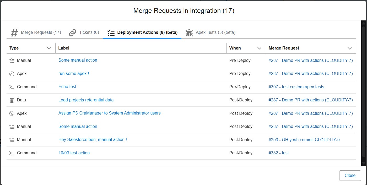 - Pull Request level: these actions will be run during the deployment of a feature pull request, but also during deployment of Pull Requests between major branches (ex: