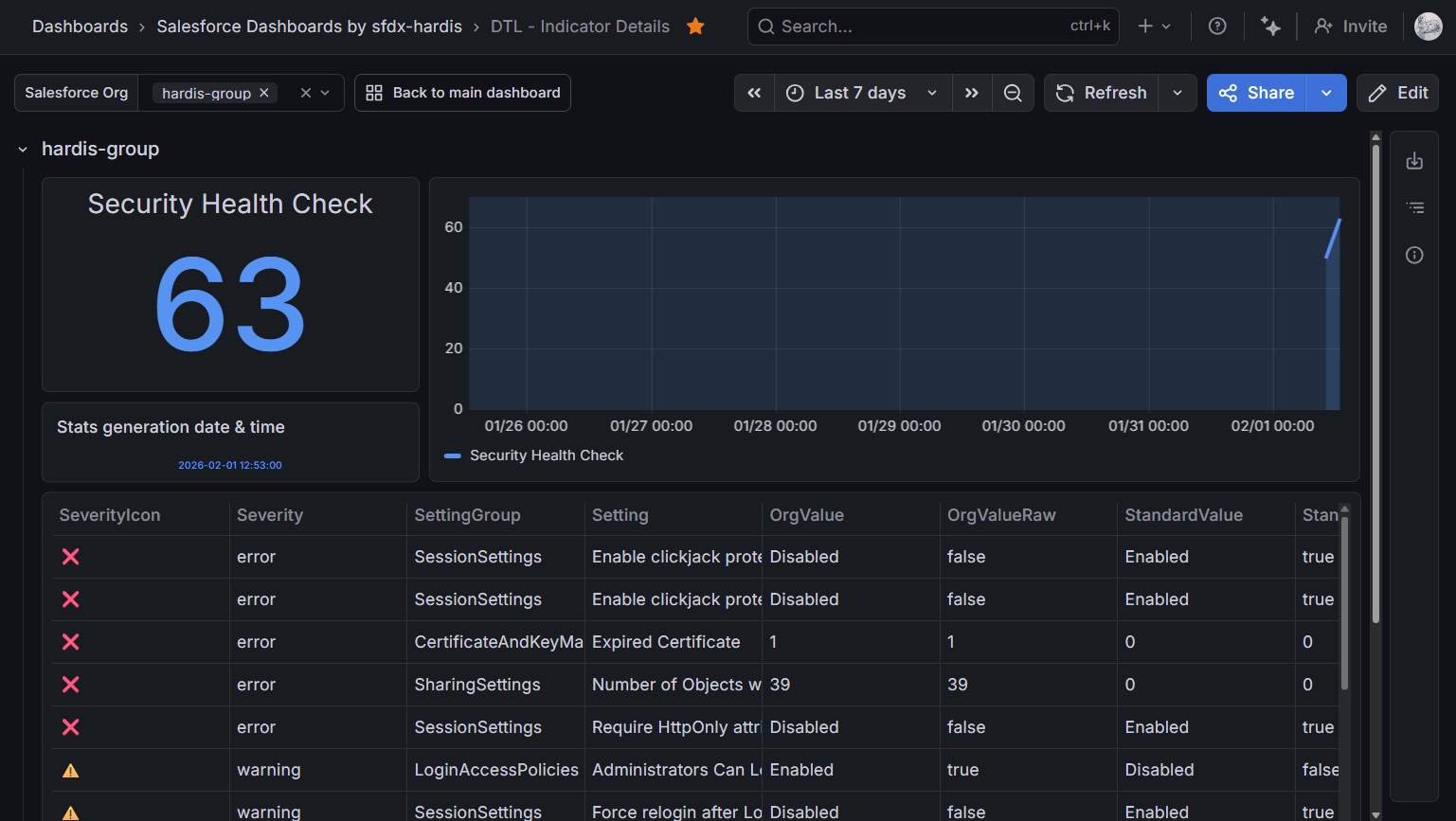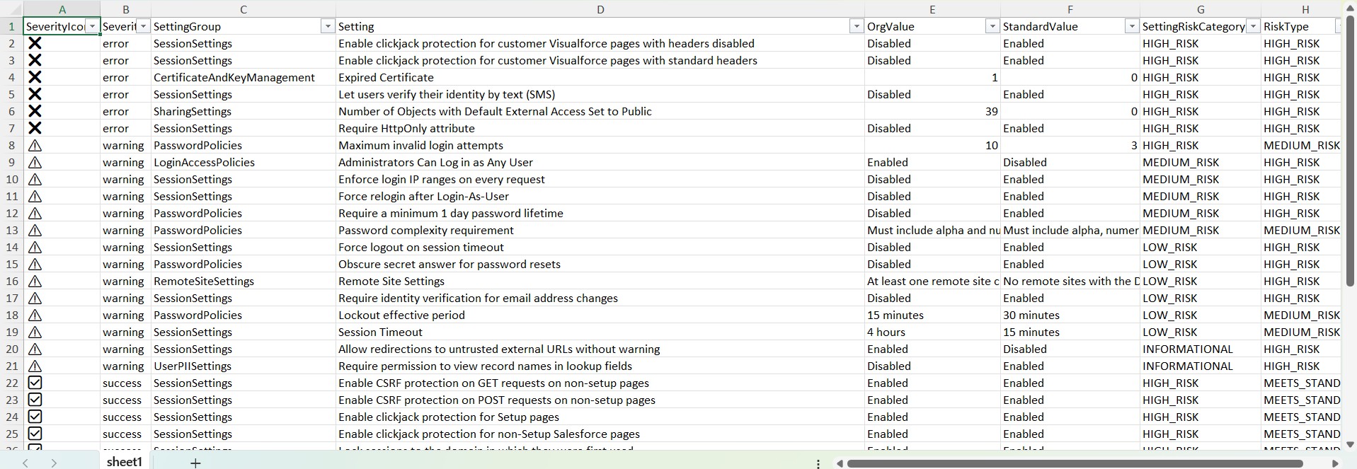 The command reads the Salesforce Security Health Check report and summarizes how your org compares to the baseline across these areas: